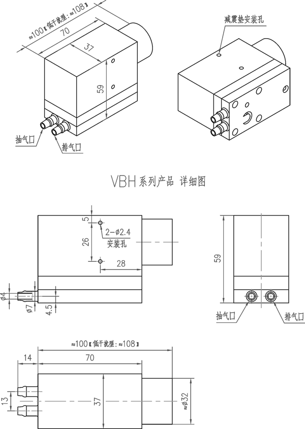 1.VBH系列微型真空泵外形尺寸图(以下图示单位:mm)