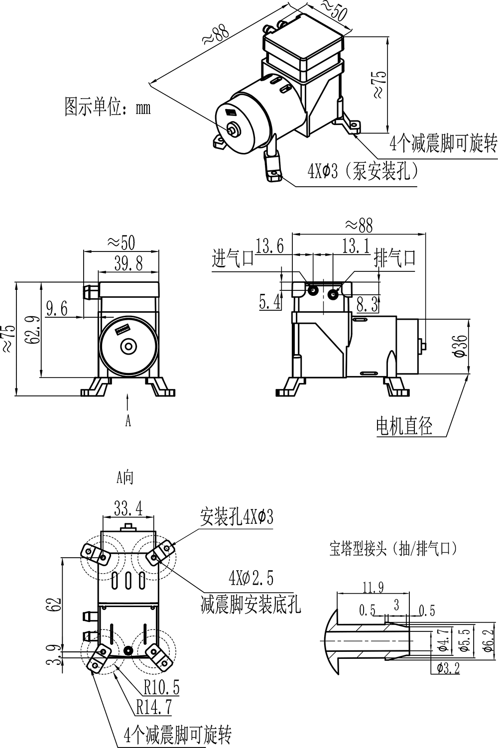 (2)泵的排气口必须保持畅通!排气端不得布置大阻尼元件,否则请选择 F25N 或 F35 或 F50 或 F60 微型抽打两用气泵产品。