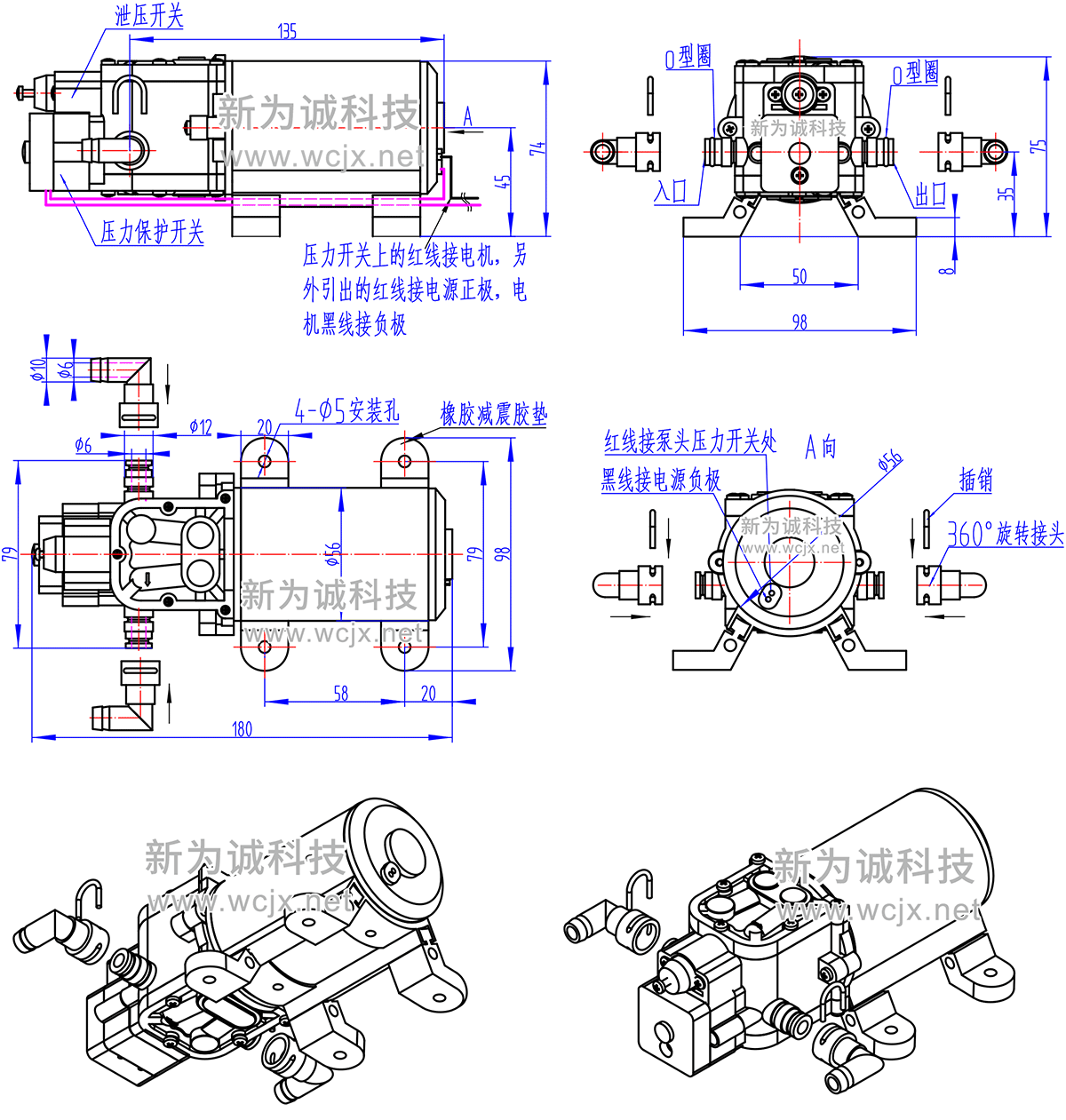 因生产加工装配中,脚垫等橡胶零配件有一定弹性、个体差异、模具加工误差等因素,导致实际安装孔等尺寸,可能有一定误差(一般误差1-2mm,都属正常范围);故以上新为诚微型泵安装尺寸仅供参考;客户在据此设计安装定位等时,应充分考虑到这点,新为诚不承担因此带来的任何损失!敬请知晓,谢谢!