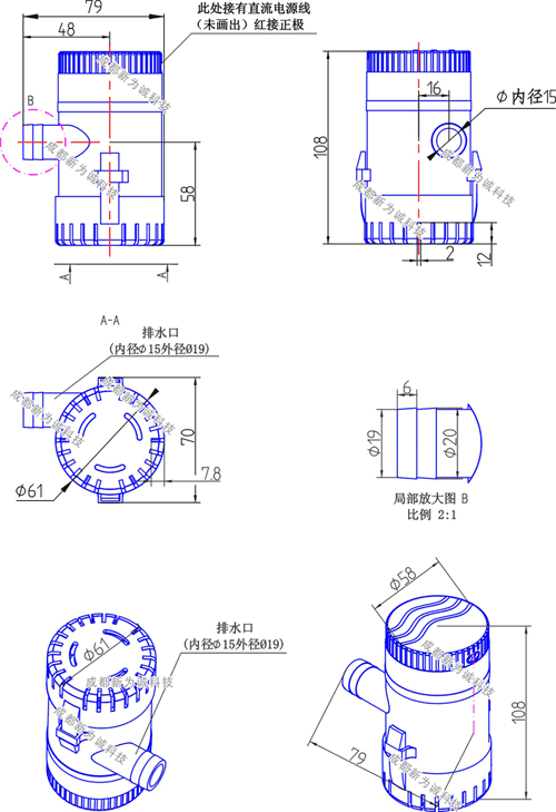 3.该系列微型潜水泵内部没有止回阀,断电工作时,若排水端液面高于进水端液面,液体会有倒流现象,直到两端液面平行无落差。故停机时若要实现“止回”(阻止回流)功能,必须要另外借助阀门、防止倒流的特殊接头等才能实现,这点请注意。